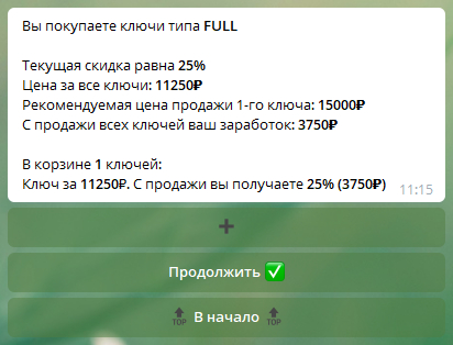 Agar siz savatga yana 2 ta FULL tugmachasini qo'shsangiz, u holda sizning chegirmangiz 35% gacha ko'tariladi, ya'ni. savatdagi har bir kalit 9750 dollarni tashkil qiladi va ularning hammasini sotish orqali siz 15750 dollargacha pul topishingiz mumkin (har bir kalitdan 5250 dollar).